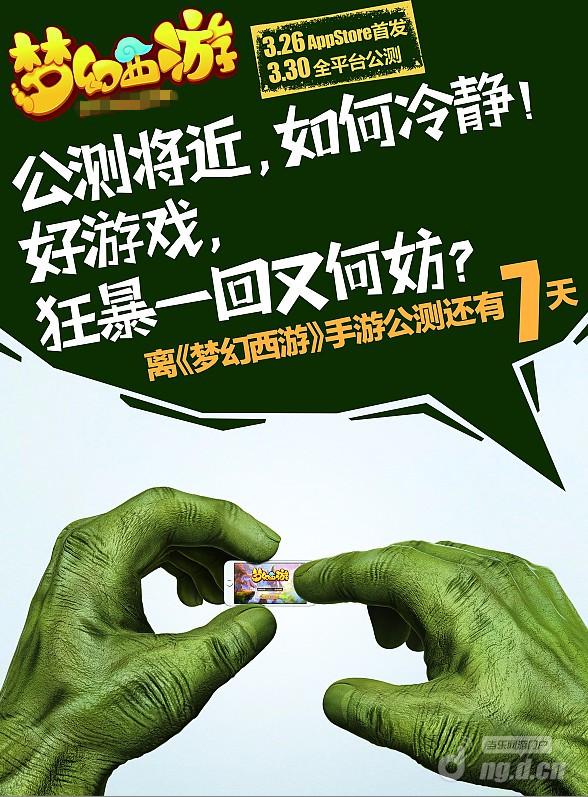 《梦幻西游》手游于今日宣布即将于3月26日全面登陆iOS平台,并于3月30日开启Android全平台公测!其实早在删档首测和不删档二测阶段,《梦幻西游》手游就以其丰富的创新性玩法而被认为打破了昔日重度手游假社交、假战斗、假交易的迷局,重新定义了回合制手游的新规则。今日,官方公布了《梦幻西游》手游的第四张倒计时海报,暴躁的绿巨人也因公测时间的临近而更加无法冷静!