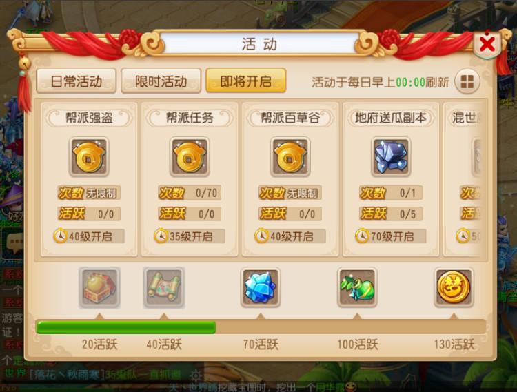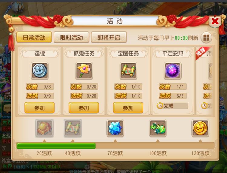 日常活动界面:完成可获得活跃度,能领取相应的道具奖励