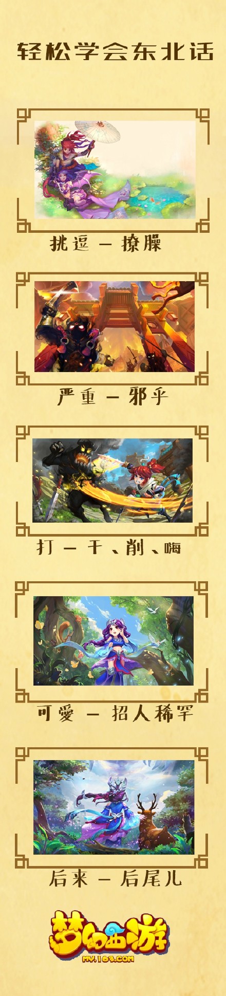 《梦幻西游》手游小编前几天论坛上遇到了个东北爷们儿,纯滴!聊了几句倍感亲切啊,小编太喜欢他那口音了,他形象地用《梦幻西游》手游配图教了我几句他们那疙瘩的话……