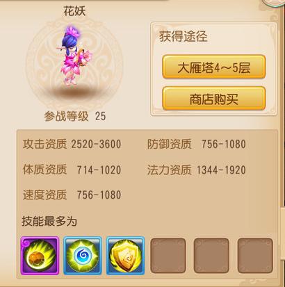 花妖是梦幻西游手游的宠物!在大雁塔4—5层出现!参战等级为25级。