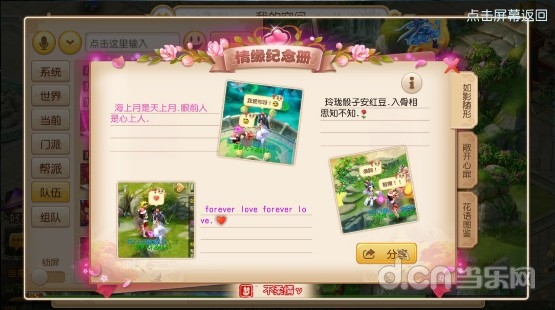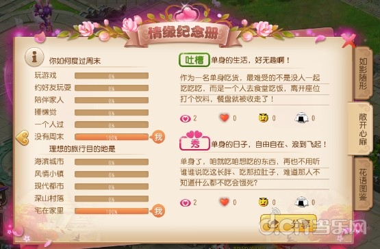 对于许多玩家而言,情人节无疑是一个最适合表白的季节。在活动期间,玩家只要在情缘纪念册中完成两道选择题和一道文字留言,即可将自己的心愿写入其中,并分享给其他玩家。而其他玩家也可以在活动界面-敞开心扉页面看到玩家的留言以及对应人气。也许在分享自己心愿的过程中,玩家也将找到属于自己的知音!