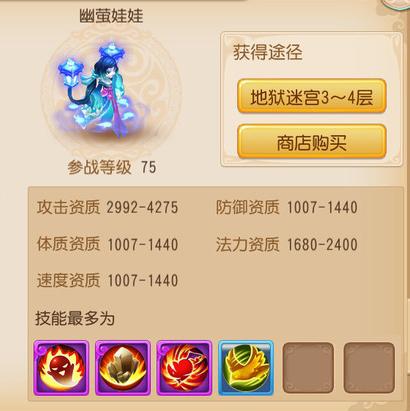 幽萤娃娃是梦幻西游手游的召唤兽宠物!在地狱迷宫3-4层出现!参战等级为75级。