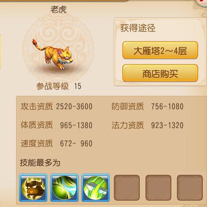 老虎是梦幻西游手游的宠物,在大雁塔2—4层出现,参战等级为15级。