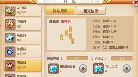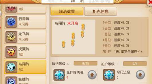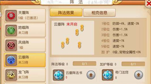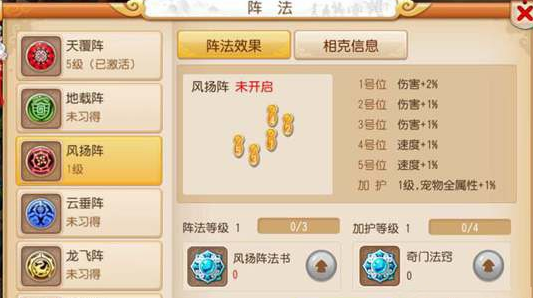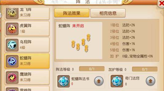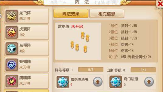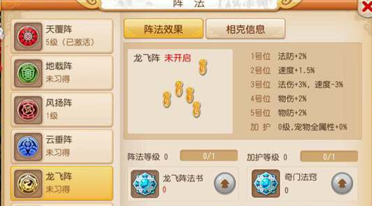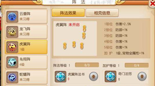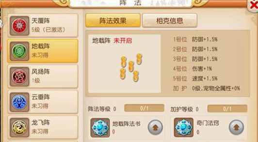 手游中阵法对于宠物的提升效果是独立出来的,为一种加护,1级加护就是提升宠物全属性1%,加护等级需要购买奇门法窍(一种道具)来升级。