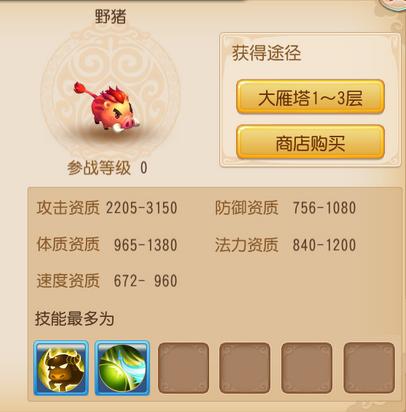 野猪是梦幻西游手游的召唤兽宠物,在大雁塔1—3层出现,参战等级为0级。
