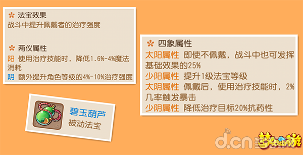 碧玉葫芦:战斗中提升佩戴者的治疗强度。普陀的标配法宝,直接增加治疗强度。四象属性一般是选择少阳,提升1级法宝等级就相当于直接提升治疗量。也会有玩家选择太阴属性,2%几率触发治疗暴击。