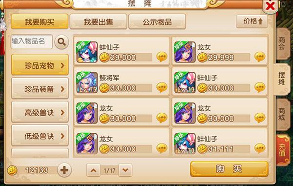 1、在摆摊处购买玩家上架的“珍品宠物”、“珍品装备”