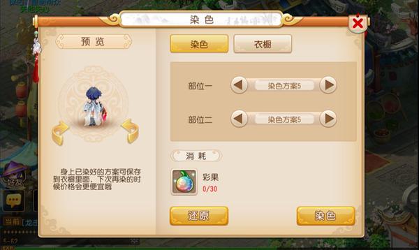在染色完毕后,玩家还可以花费一定的金钱,将你目前的染色方案保存到衣橱中去。然后若是你需要染回衣橱中的颜色,只需要消耗原方案10%的彩果或者花豆。而从目前笔者实测来看,系统尚且无法分辨出染色真正需要消耗的花豆和彩果,而只能判断出你目前身上所染色彩是源自于花豆还是彩果。因此比如说,你目前搭配是方案是部位一用了方案一,部位二用了方案二,而衣橱则为部位一为方案一,部位二则是方案三,照理来说只需要缴纳两个花豆就可恢复衣橱内的方案,但系统依旧需要你花费三个花豆。