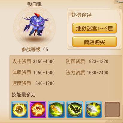 吸血鬼是梦幻西游手游的召唤兽宠物!在地狱迷宫1-2层出现!参战等级为65级。