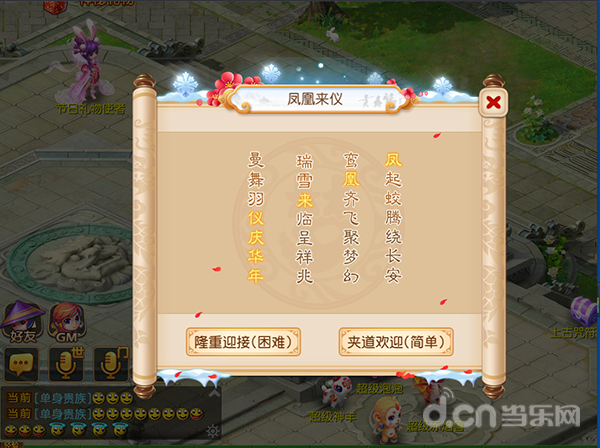 随着嘉年华盛宴的开启,冰凤凰、风若雪也特地来到三界之中,以一场特别的大雪,为嘉年华献上自己的祝福。在2016年12月2日~2017年1月7日期间,玩家只要完成各种节日活动,或者达到一定活跃度,就能够获得大雪雪花,用于兑换各种能够稀有游戏道具!