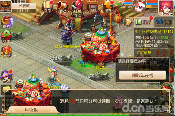 团圆年夜饭:只要你消耗5点节日积分,即可获得不同功用的年夜饭为自己增加临时属性或者气血魔法储备。