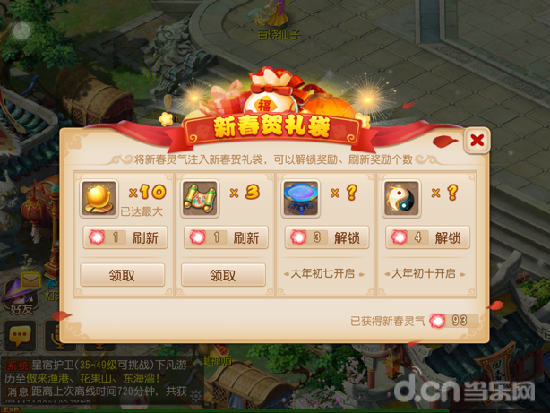 新春贺礼袋:只要你等级≥50级,即可在特定日期使用新春灵气开启新春贺礼袋中的四份礼物,获得丰厚奖励!