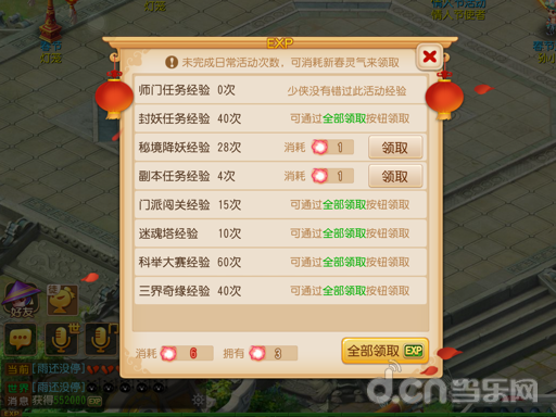 新春经验袋:从2月3日到3月3日,只要你消耗新春灵气,即可在新春经验袋中领取错过的日常活动经验,让你即便在不能登录游戏的时间里,也能与其他玩家站在同一起跑线上!