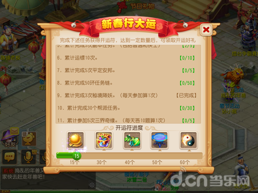 新年行大运:从2月17日~3月3日,只要你完成一定次数的日常活动,即可获得开运进度,当你累积到一定的开运进度时,即可领取一次奖励,让你获得无数惊喜!