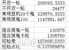 第三种,普通7只,领双3只。根据假设,一轮抓鬼经验为5.54万。而根据规则,计算得到每天可进行14轮7/3+1轮2/8抓鬼,计算后得到经验为85.1万。