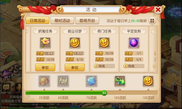 那么如何才能凑满130点活跃度呢?首先请大家注意,每天凌晨刷新活动时,活跃度也会随之刷新,这时候在活跃度奖励界面,玩家会发现某一个日常活动的图标中有“推荐”字样。在今天,如果你完成这一活动,能获得双倍活跃度(比如秘境降妖中如果你闯过了五关,过去只能获得5点活跃度,而在活动推荐时可以获得10点)。显然它能大大降低你凑活跃度的难度。