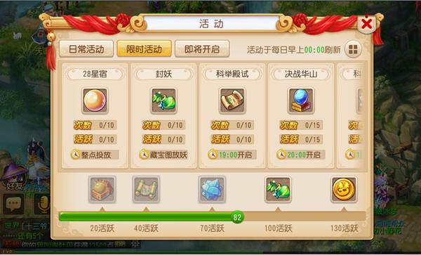 在完成日常活动之后,你会发现你的活跃度还差了一点,这时候限时活动就会为你补充足够的活跃度。在这里笔者推荐只有周日没有举办的科举大赛活动。无论从活跃度、经验、物质奖励、难度等各方面来看,它都可以说是玩家不该错过的日常活动。