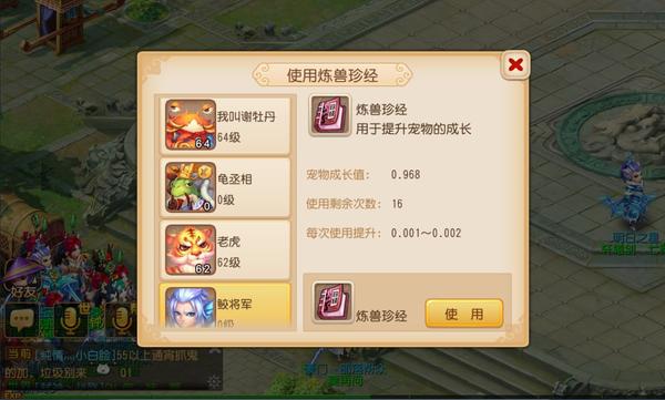 决定召唤兽核心价值的在于技能栏的多少,而决定它究竟能获得多少极限属性的,源自于他的资质和成长。而炼兽珍经即是提高召唤兽成长的利器。根据召唤兽携带等级的不同,召唤兽可使用的炼兽珍经数量也不同,携带等级越高,炼兽珍经可使用的次数越多。另外每一只召唤兽所能被炼兽珍经提升的成长各有不同,所以在使用之前请务必多行比较。