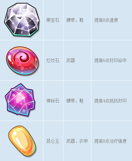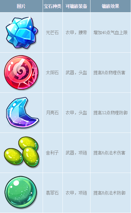 宝石是可以用来加强装备的特殊材料,游戏中的宝石共有9种,每种宝石所附加的属性各不相同。
