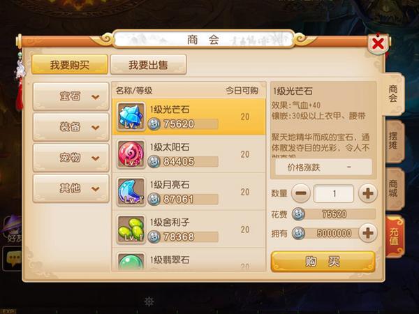在主界面的“商城”中的“商会”可以直接购买或售出宝石,宝石的价格将会根据购买或售出情况而有所变化,同类宝石每被购买一颗,价格会有一定上涨,同理,同类宝石每被玩家售出一颗,价格会有一定的下降。