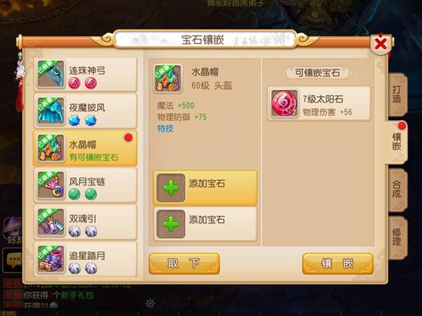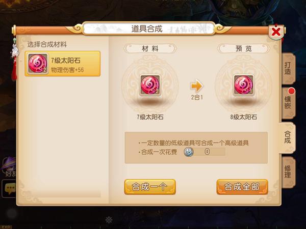 玩家可以打开主界面的“打造”,然后选择“合成”切页,就可以进行宝石镶嵌的操作。两颗宝石合成为一颗高一级的宝石,合成时需要满足以下条件: