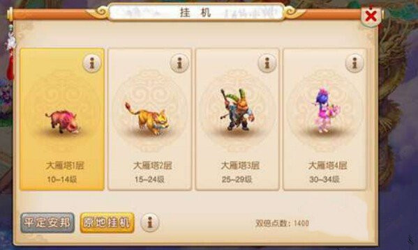 大家可以根据自己的等级到合适的地点进行挂机.从图中可以看到双倍点数.看来挂机的时候还可以获得双倍经验加成哦.我们可以获悉挂机怪物从大雁塔1层至4层,等级也从10级到30级,玩家根据自己能力和需求选择挂机。