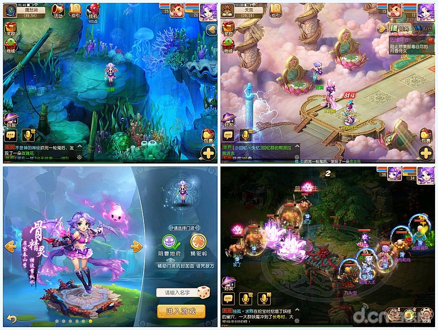 《梦幻西游》手游依旧沿用端游的 Q 版的游戏画风,色彩明丽、饱和度高。游戏在场景方面,在对端游进行还原的同时增加了一些细节方面的设计,使其游戏画面相较端游更加细腻,玩过端游的玩家在跑地图时,仙气盎然的方寸山、精美绝伦的普陀山、庄严肃穆的大唐官府、如梦似幻的龙宫、诡异静谧的阴曹地府、以及霸气粗犷的狮驼岭想必都会让你觉得无比熟悉,同时又能发现一些小惊喜。