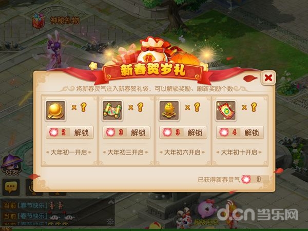 在新春贺岁礼中,玩家可以在大年初一、大年初三、大年初六、大年初十四天时间里登录游戏,解锁新春贺岁礼,并消耗一定新春灵气,获得更多的道具奖励。