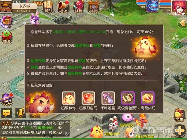 在为玩家送上丰厚好礼之后,很快咕咕财神就将回到天庭,为了感谢玩家,在2月2日~2月8日的每天20:00~20:30,咕咕财神将为玩家洒下祝福。玩家可以在此期间参与每晚10轮的祝福夺宝活动。在活动进行中,玩家只要努力抢夺祝福,变身成超级神鸡,或者在每轮比赛结算时保持神鸡祝福在身就可以获得奖励,除此之外,在活动中更有神兽超级神鸡、千叶莲露、超级幻色丹、高级魔兽要诀等奖品随祝福发放!让玩家收获满满的幸运!