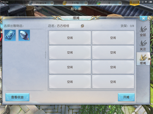 3、道具出售 通过点击摆摊界面右侧“摆摊”选项,可进入到自己店铺的摆摊界面,在该界面可以查看自己已经上架的道具,点击左下角“查看收益”可以查看道具出售情况;