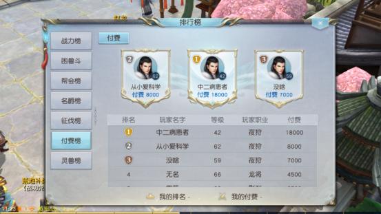 最大的特色亮点排行榜来了,就是让人从来没有见过的付费榜。玩家可以在付费榜里面看出,哪个玩家在游戏中进行了充值,充值的费用为多少,然后在另外的排行榜上分别达到了哪个层次。了解哪个是本区的超级土豪,抱大腿要趁着土豪没出名之前抱大腿。