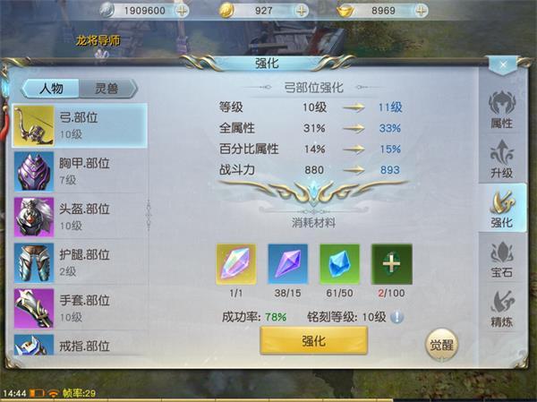 3、装备升级/强化 点击属性界面右侧“升级/强化”按钮,可以看到当前人物/灵兽身上各个装备的等级/强化等级,点击对应装备消耗特定的道具和银币可以对装备进行升级/强 化,装备等级不能超过人物等级(强化等级也有相应的限制),当你置换一件更高阶的装备时,不必担心这个装备需要重头开始升级,因为这个机制是继承的,当你 置换完一件装备之后,该装备等级与您置换前一致;