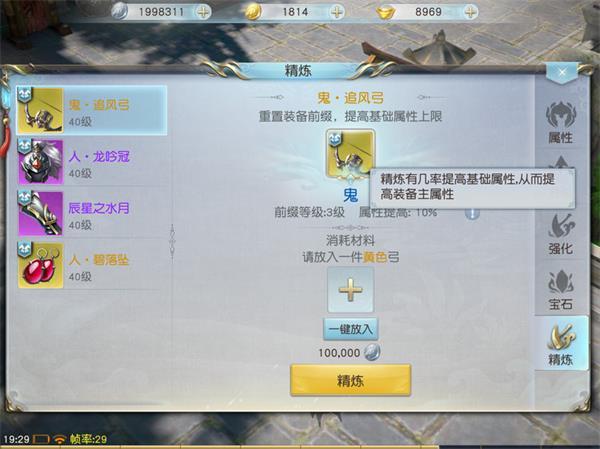 4、装备精炼 点击属性界面右侧“精炼”按钮,可以看到当前人物装备的精炼程度,点击对应装备消耗同颜色装备和银币可以对装备进行精炼,精炼有几率提高装备基础属性,从而提高主属性;