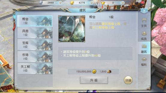 玩家可以在主页面里面寻找到“帮会”功能按钮,可以通过帮会主页面看到整个帮会的大体内容。比如帮会名称、帮主、人数、人气、繁荣度、资金、福利、 个人帮贡等等一系列介绍。帮会里面大体分为主页、成员、建筑、福利四大栏目,接下来让我们看看《镇魂曲》的帮会有什么特色玩法。