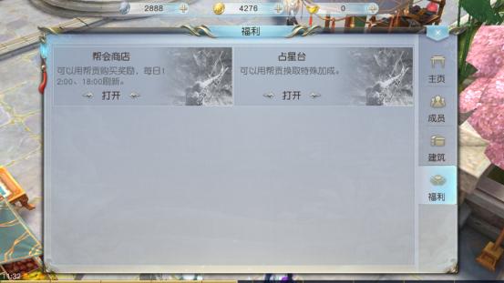 玩家能够在帮会的福利页面看到帮会商店以及占星台两个专属帮派福利。其中帮会商店里面玩家可以通过帮贡来购买专属于帮会商店的物品。不过帮会商店里 面的商品是会变动的,分别在12:00与18:00的时候会进行刷新,因此大家要把握好时间进行购买物品。至于占星台,则可以使用帮贡来换取特殊的加成。