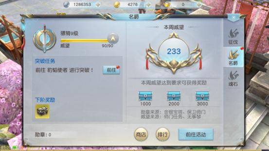 与征伐系统差不多的就是名爵系统,名爵系统主要是收获个人威望。玩家能够通过师门任务、无筝琴这两个日常活动来获取威望,也可以通过金银宝塔、保卫师门这两个活动来获取勋章。通过使用勋章来获取威望。
