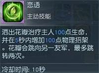 主动技能——恋语:洒出花瓣治疗主人100点生命,并在五秒内增加100点物理招架。花瓣会跳向另一个友军,最多跳转两次,冷却时间10秒。