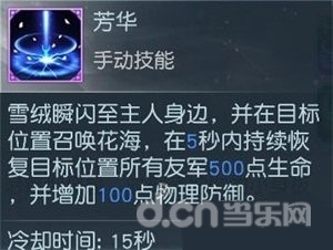 手动技能——芳华:雪绒顺闪至主人身边,并在目标位置召唤花海,在五秒内持续恢复目标位置所有友军500点生命,并增加100点物理防御,冷却时间15秒。