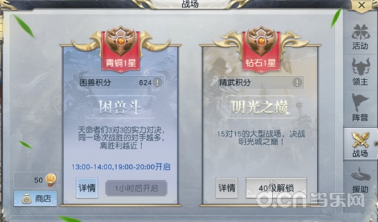 困兽斗是小型PVP玩法,采用3V3的模式进行对决,每天13~14点、19~20点开放;而明光之巅是游戏中15V15的大型战场玩法,每天21-22点开放且需要玩家等级在40级以上才可参与。