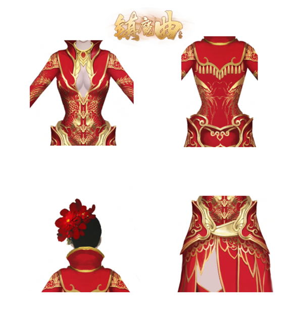 从官方给出的时装设定图可以看出,六大职业的婚服还是沿用了传统中式风格,以喜庆的中国红为主色调,配以龙凤雕文和金饰,从细节处流露出低调奢华的中式风情,同时官方也别出心裁的根据不同的职业的特点进行款式的改良