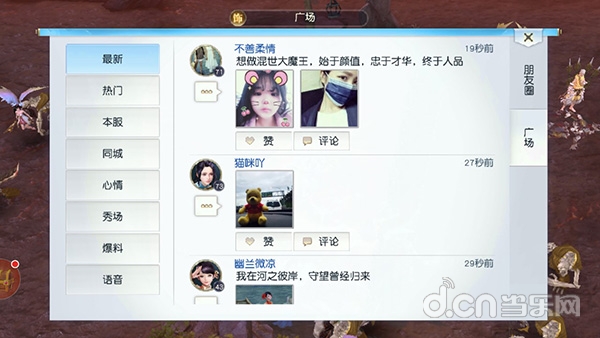 朋友很少?朋友圈很大!在朋友圈中天命者不仅可以分享游戏小心得,还可以发布招募固定团队及帮会成员。除此之外,游戏朋友圈的广场中还提供了热门、最新、综合、秀场、攻略、同服、同城等小版块,帮助天命者可以更加轻松地获得游戏热门、最新的圈内信息。