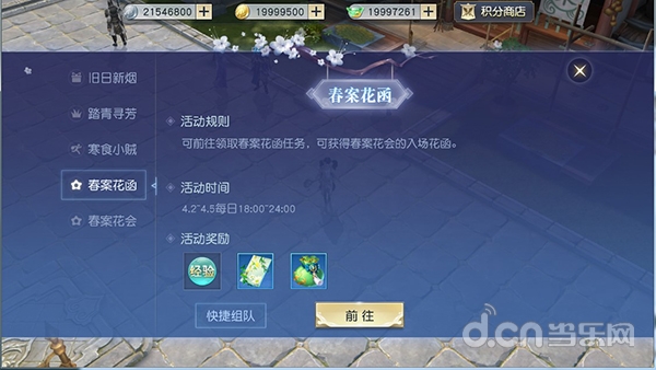 每天晚上18点,天命者们都能通过春案花函任务获取春案花会入场花函,并凭此参与第二天中午12点开始的“春案花会”,在鲜花掩映中获取花骨朵、领取稀有道具、银币等丰厚奖励。