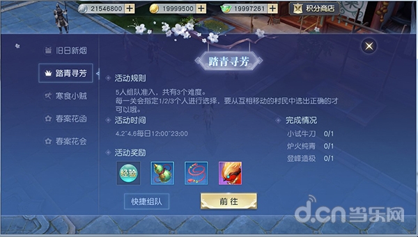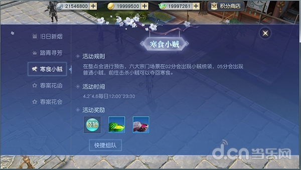 每天中午12点开始,天命者们还可以组队前往踏青寻芳,只有在天命者们从众多怪物混杂、快速调换位置的情况下成功“寻芳”找出对应的村民本尊方能成功过关,赢取奖励。在每个整点,六大宗门内还会有小贼出现盗取寒食节物资,不同小贼需要不同职业的天命者组队前去挑战,成功保护物资后宗门将给予丰厚奖励!