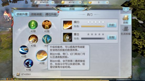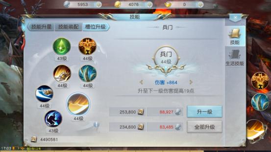 在点击“技能”功能后,玩家可以在“槽位升级”里面看到技能升级的页面。与别的游戏不同,玩家在进行技能升级的时候,除了有钱之外,还需要历练点。 历练点是玩家通过各类任务、活动所获得的奖励,其功能主要是用来升级技能。通过花费银币以及历练来进行技能等级升级,每一次的技能提升之后,都会增加相应 的技能伤害。