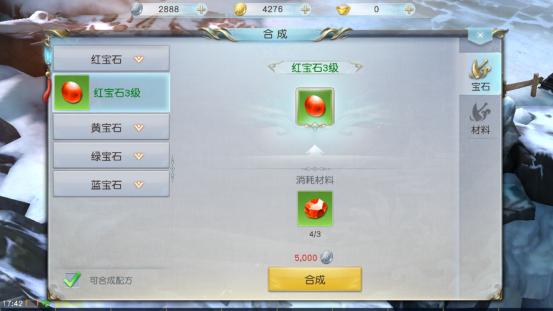 在合成系统的宝石合成里面,玩家可以通过点击宝石页面可以进行宝石合成,在图中可以直接点击下面的可合成配方直接直达目前可以合成的宝石选项中。在 图中可以看出,由红宝石3级合成到红宝石4级,只需要3颗相同品种的宝石以及少量的银币即可合成,比其他同类手游良心了许多,而且也没有合成概率或者别的 因素参杂进来,想怎么合就怎么合。