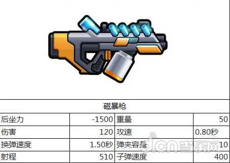 磁暴枪的单发伤害很高,单发子弹伤害打到了120,在枪械类武器中仅次于巴雷特。同时射程较远,远高于大部分其他枪械。虽然和巴雷特相比有所欠缺,但其子弹的爆炸半径与攻速远高于巴雷特。同时磁暴枪的武器重量较轻,能使携带者在输出的同时能进行灵活的跑位。保证了自己安全的输出环境,甚至在特殊时刻进行残血反杀。