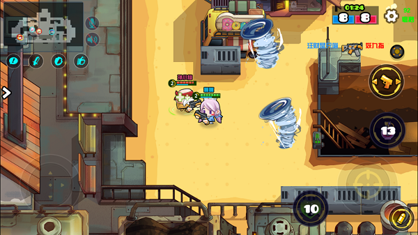 【二技能】龙卷风胶囊:向目标方向投掷龙卷风胶囊,胶囊爆炸后产生龙卷风,所触碰的任何单位都会被随机方向强制位移一段距离,包括子弹