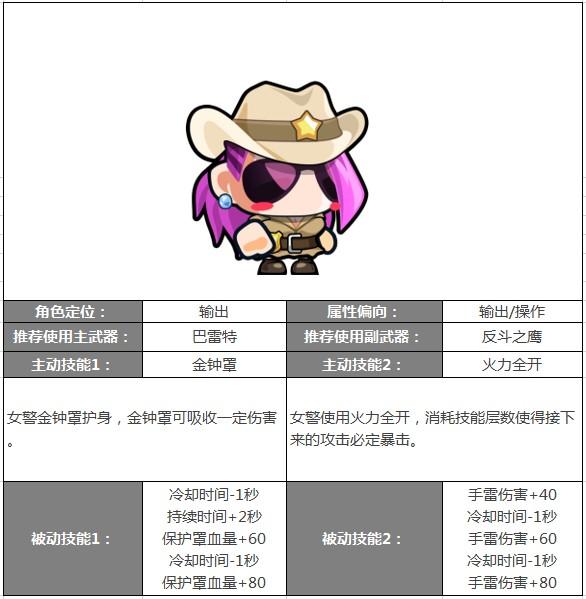 女警火力全开,接下来的攻击必暴击,暴击次数取决于技能等级。火力全开是女警的核心技能,女警搭配暴击对敌人的伤害会大增,进攻时只要技能CD到了就可以立即使用。