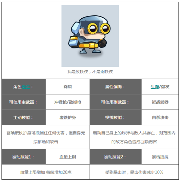 《反斗联盟》中的废铁侠是一名肉盾型角色,和另外一名肉盾“坦克”不同的是,坦克是开护盾保护队友,而废铁侠则是要冲进敌阵吸引火力并牺牲自己击杀敌人,总之都是和坦克一样要舍己为人。