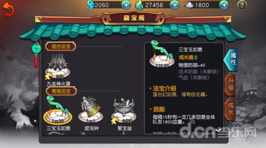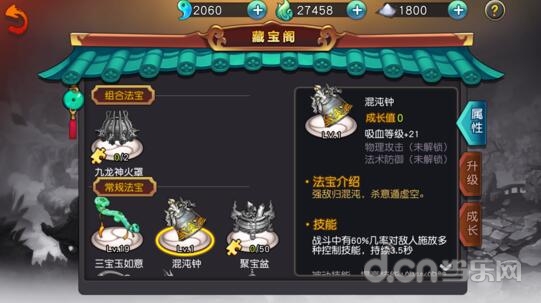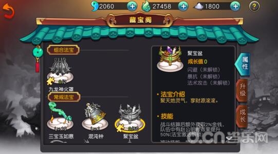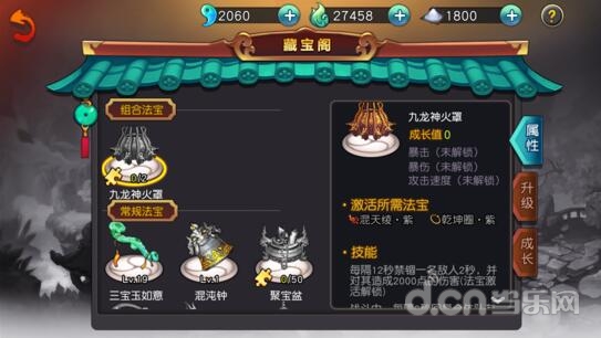在藏宝阁你可以对所拥有的法宝查看属性,进行升级与成长。下面就让我们来大概了解一下这些法宝吧
